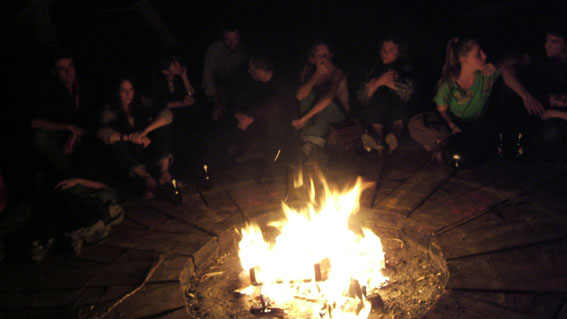 A wood floor with fire in the middle, made in the site of the artistic association Jardin d’Alice in Paris. During public events, everybody can gather around the fire.