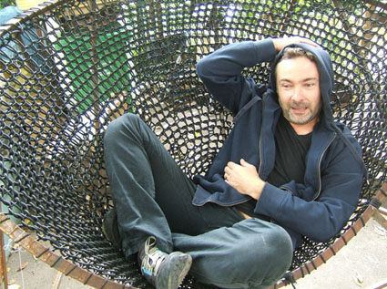 Une loveuse géante, en structure d’acier, sur laquelle j’ai crocheté du cordon de caoutchouc très résistant. Le résultat donne une assise souple et à toute épreuve, pour se lover tout seul ou à cinq.
