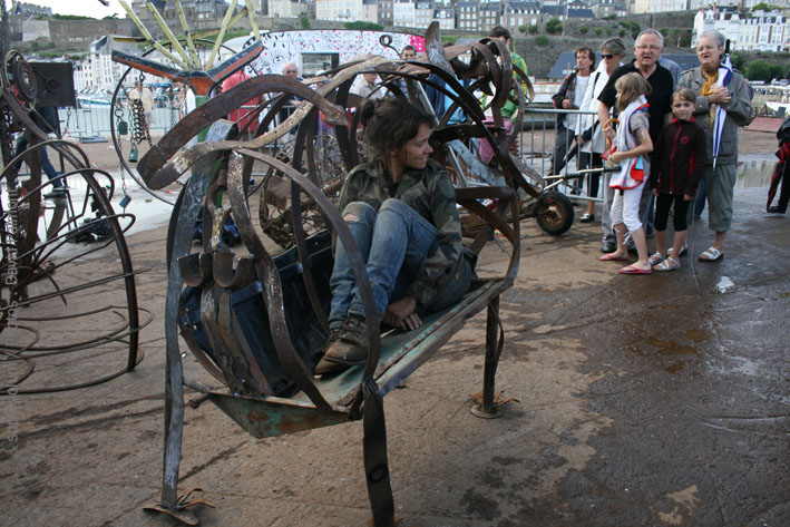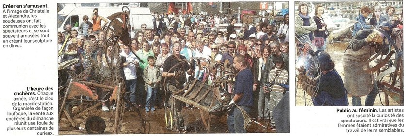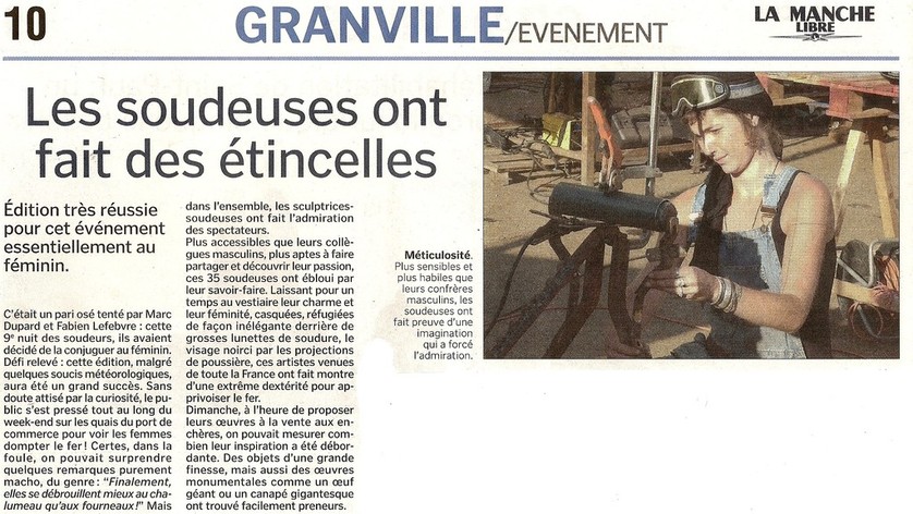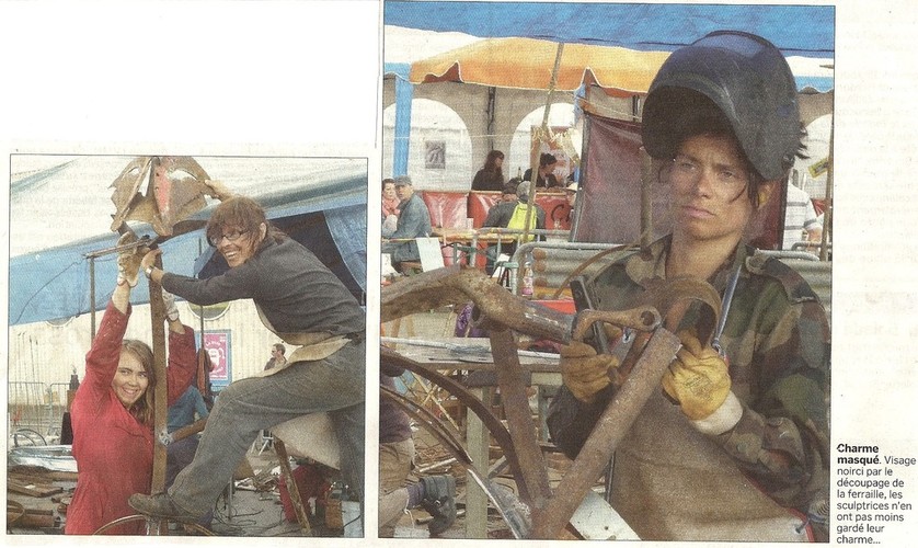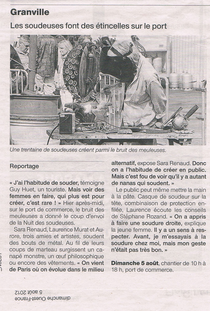 Pendant 48h, une trentaine de sculpteuses métal s’installent sur le port de Granville (Normandie) pour produire des oeuvres sur place. Un énorme tas de ferraille est mis à notre disposition, à base de machines agricoles cassées, morceaux de bateaux, vieilles ferrailles en tout genre, du tout petit écrou aux gigantesques machoires de moissonneuse-batteuse! Chacune trouve son bonheur, et on soude comme des guerrières, par vents et marées, sous la pluie ou sous le soleil (ça change toutes les dix minutes). Avec les artistes Laurence Murat et Aurore Comte, nous avons dignement représenté les parisiennes, dans une ambiance électrique!