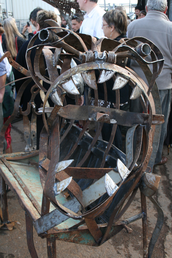 J’ai réalisé un monstre-canapé, à partir d’arceaux de tonneau, de tôles de voiture, d’une pelle et une foultitude d’objets tranchants. Le résultat est parfaitement effrayant mais tout à fait confortable. Il suffit de se jeter dans la gueule du loup! Une fois installé(e)s dans l’estomac du monstro-canapé, la digestion peut commencer, avec une bière si possible c’est mieux.